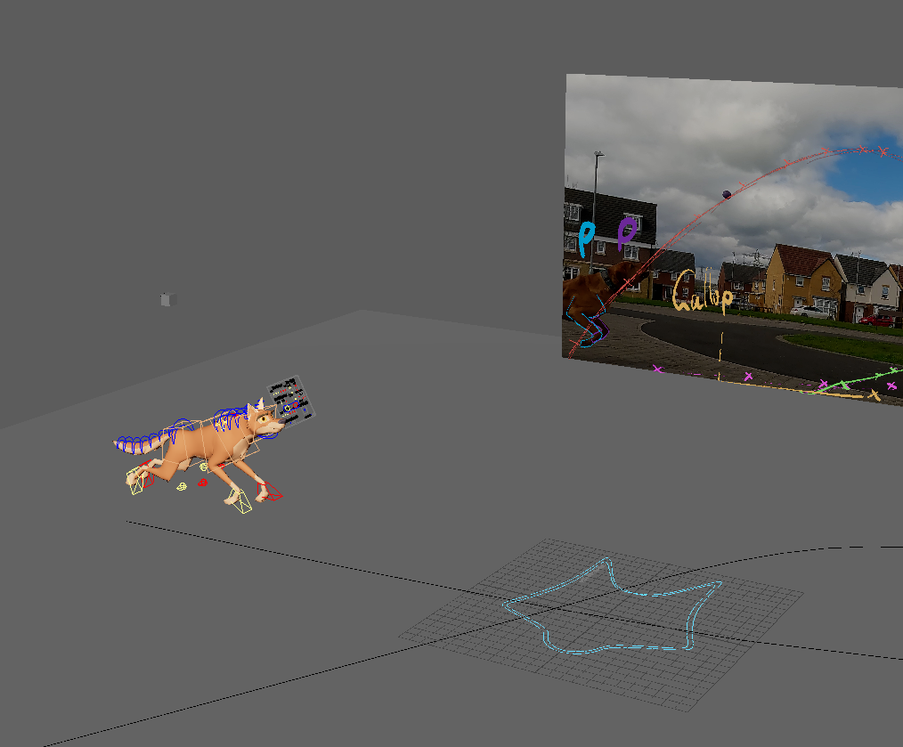 It was at this point when I returned to my theory study, in conjunction with my primary reference, to create the trot. I knew Yoshi was in a trot so I could almost treat this a little bit separately whilst I was blocking it out. This would be a lot easier than trying to match move to the video and also Yoshi was coming almost directly at the camera so there was a lot of obscuring.