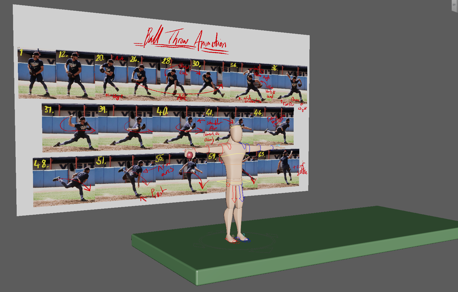 The ball throw exercise is another exciting and challenging animation exercise that studies an array of complex body locomotion. These locomotion work in conjunction with key animation principles like anticipation and follow through to make the animation impactful. The wind up is key to build strong anticipation followed by a strong throw and ending in a recoil. This will feature a lot of extreme poses to allow the ball to make impact. Furthermore, there will be the transfer of weight from one foot to the other as the ball is thrown. Reference and research will be key to identify the type of throw and influence the key poses. This blog post will explore the development of this animation from preproduction to completion.